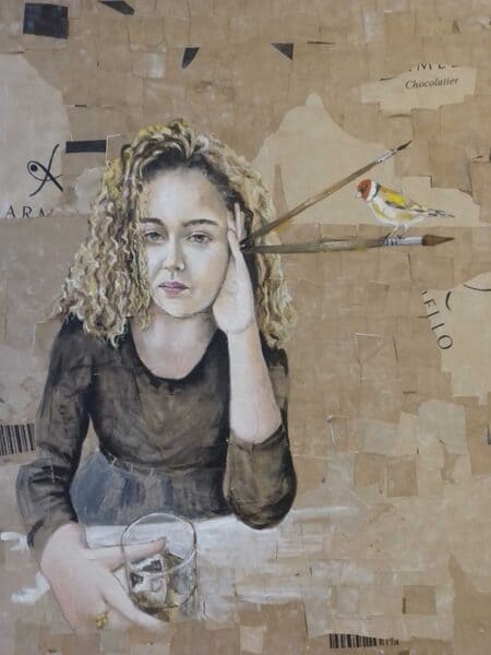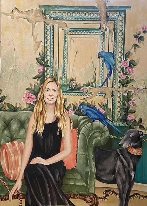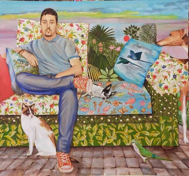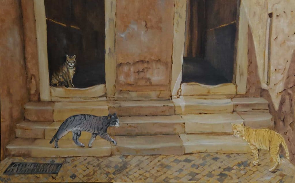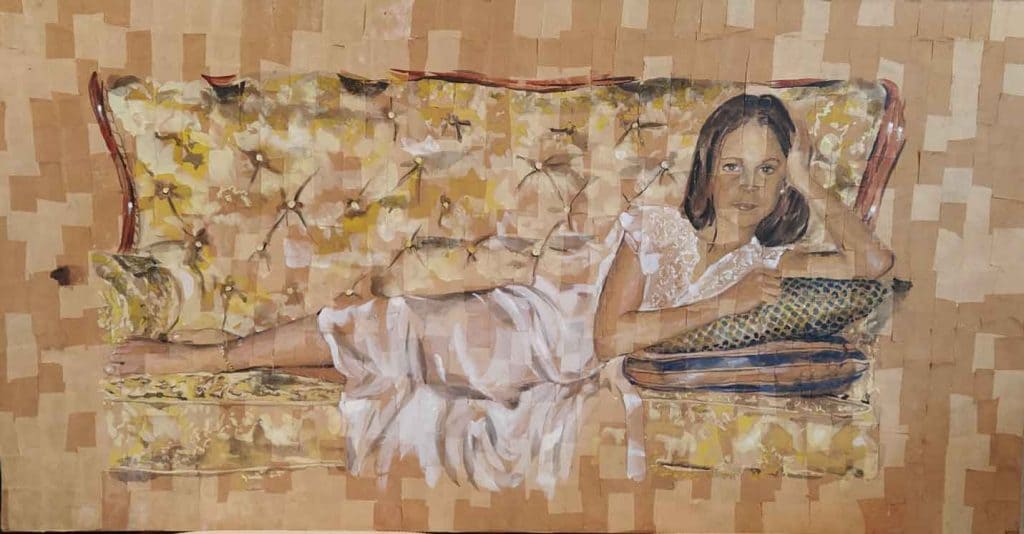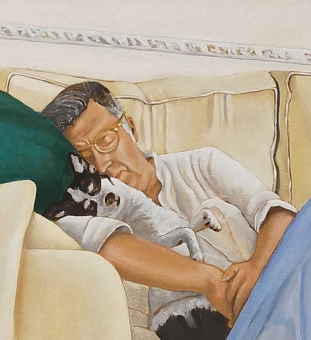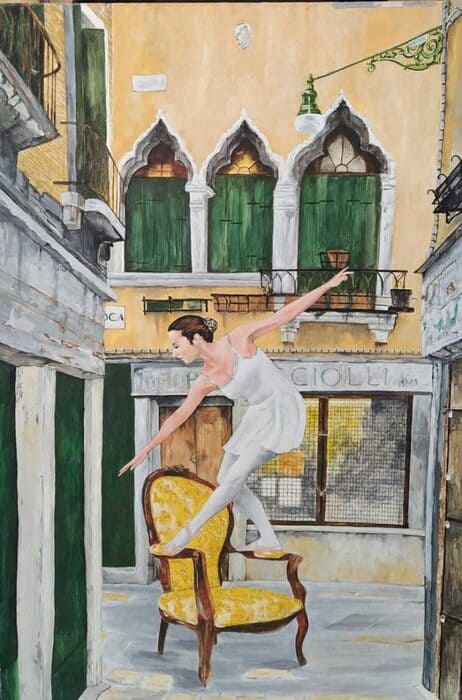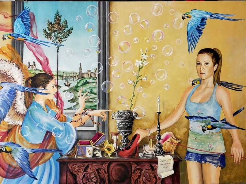 La escena se desarrolla en una estancia en la que por una ventana se ve un paisaje que recuerda al de la obra Anunciación de Castello.